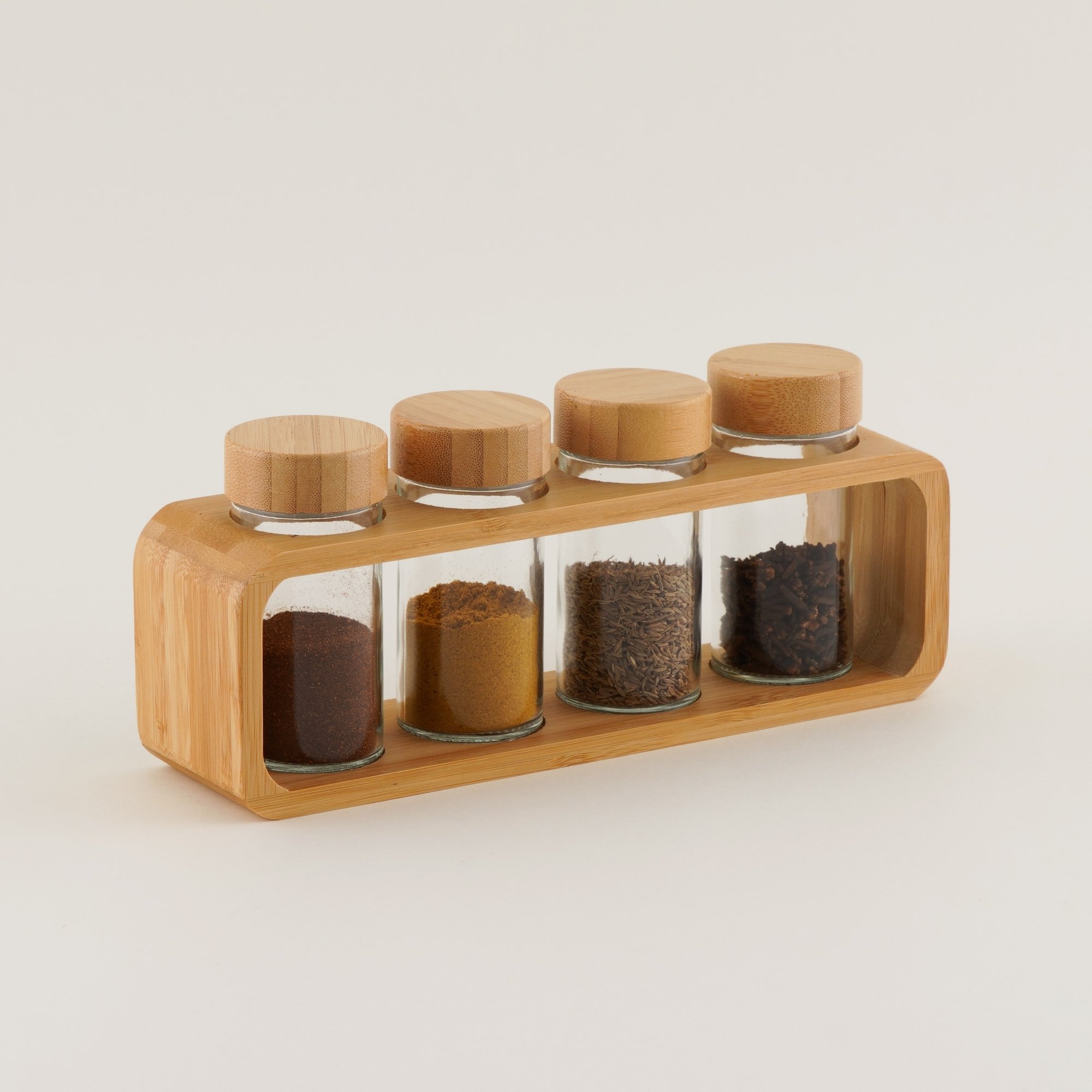 يتكوّن هذا الطقم من أربع علب بهارات زجاجية صغيرة بسعة 90 مل لكل قطعة، مناسبة لحفظ التوابل المستخدمة يوميًا. الحجم المدمج يجعلها مناسبة لوضعها على سطح المطبخ أو داخل الأدراج.الحامل المصنوع من الخشب يحافظ على ترتيب العلب وسهولة الوصول إليها أثناء الطهي، مع أغطية تساعد على حفظ التوابل بشكل منظم.