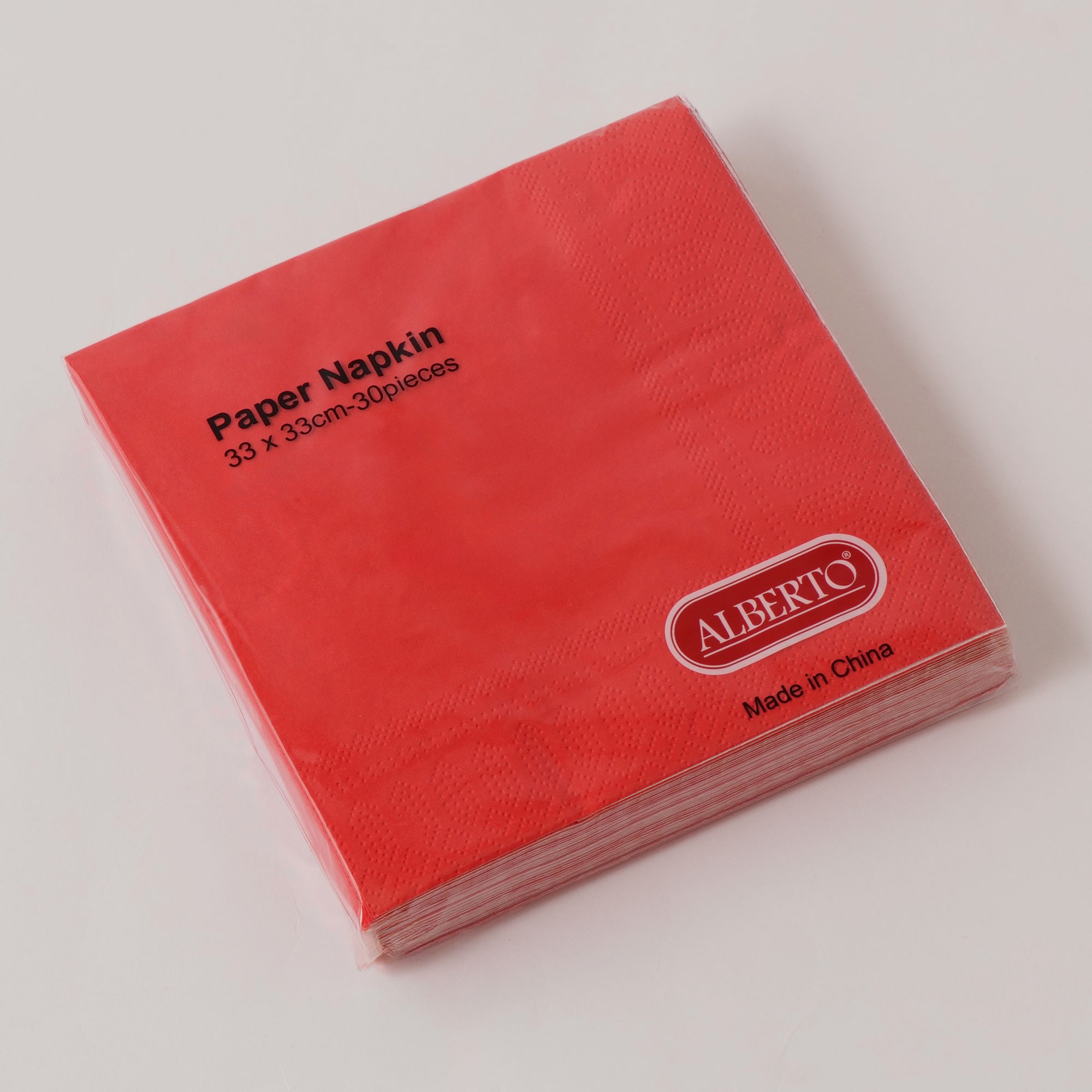 ألبرتو مناديل ورقية تأتي في عبوة تحتوي على 30 قطعة وبمقاس 33*33سم، باللون الأحمر الداكن. مناسبة للاستخدام اليومي أو المناسبات الخاصة، وتضيف لمسة أناقة لترتيب المائدة.