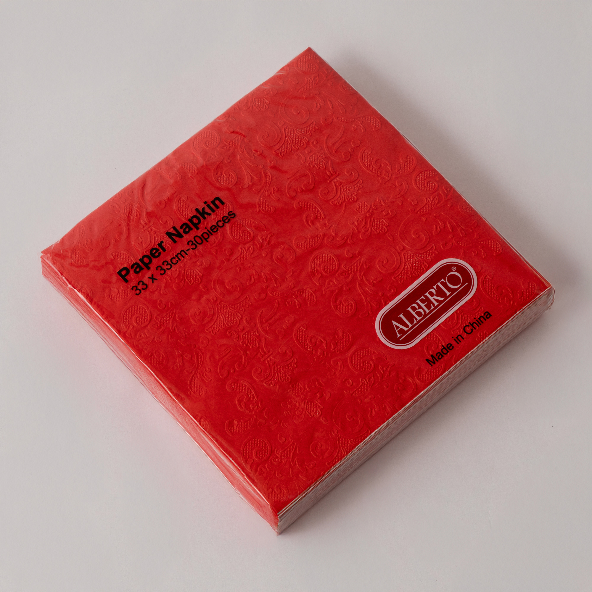 ألبرتو مناديل ورقية تأتي في عبوة تحتوي على 30 قطعة وبمقاس 33*33سم، باللون الأحمر الداكن. مناسبة للاستخدام اليومي أو المناسبات الخاصة، وتضيف لمسة أناقة لترتيب المائدة.