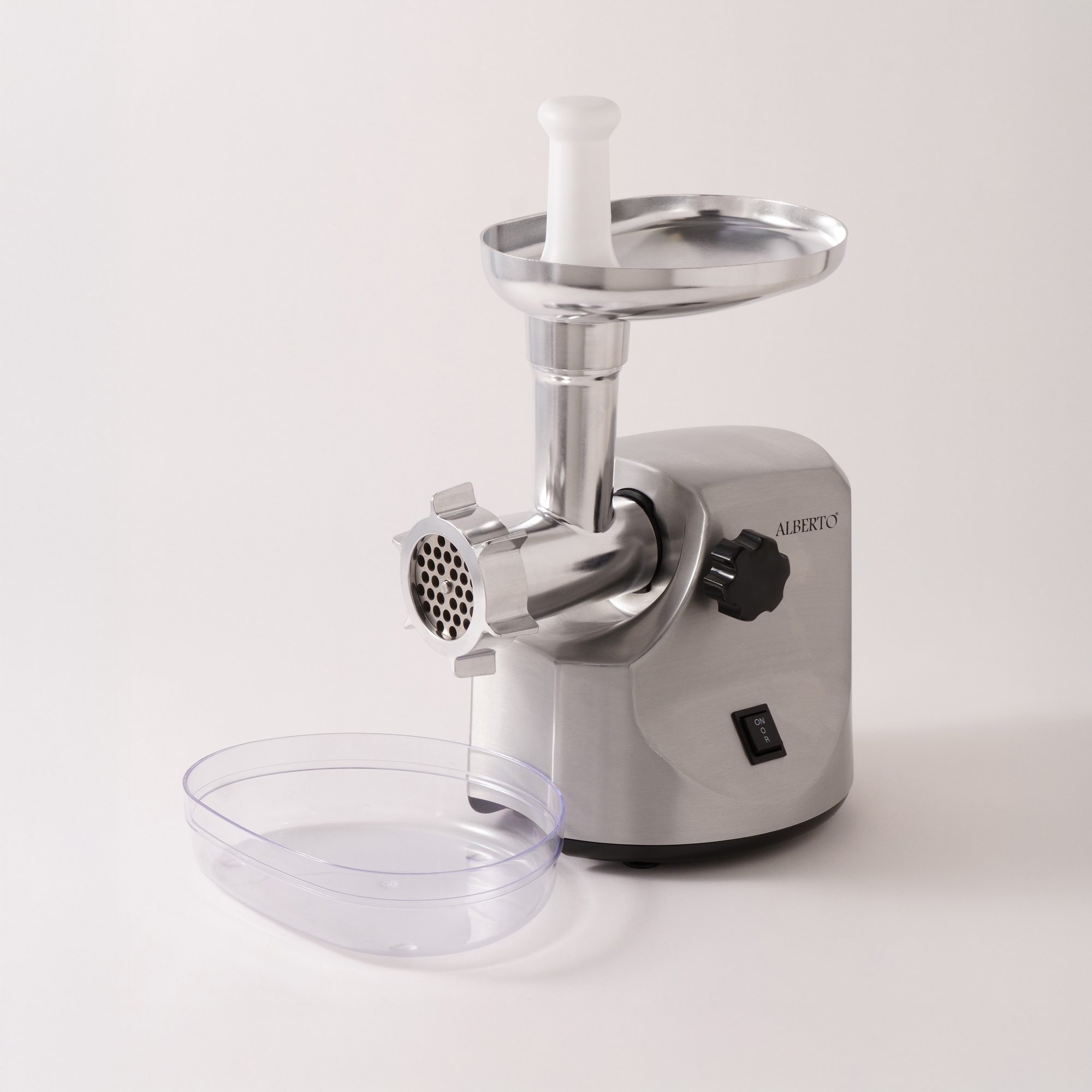 الطقم يتضمن تتضمن وحدة مفرمة اللحم، 3 صفائح تقطيع من الستانلس ستيل ناعمة، متوسطة، خشنة)، 3 أنابيب لتحضير السجق، ملحق للكبة، وضاغط طعام.