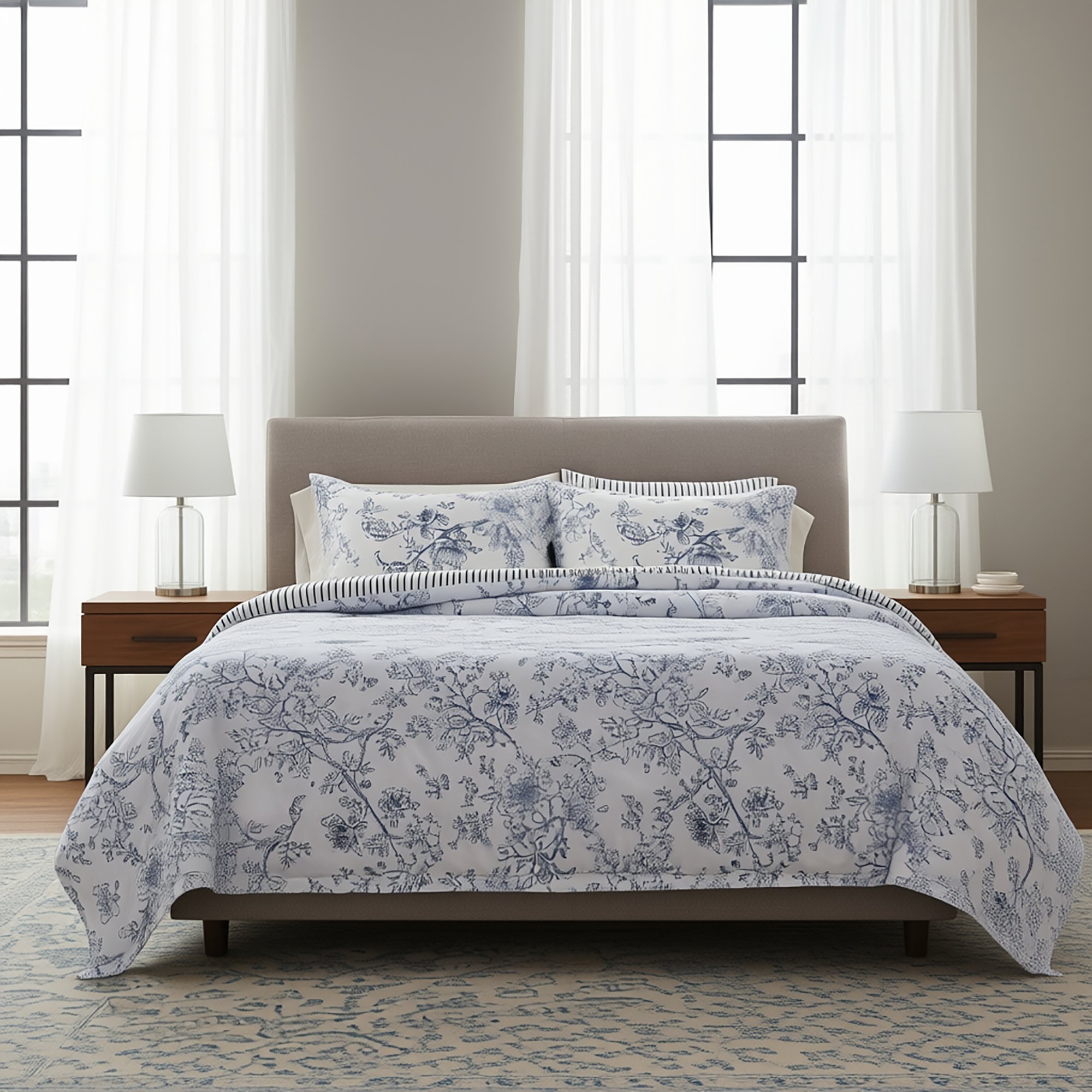 الطقم يتضمن لحاف 240*160سم، 1 شرشف مطاط، 2 غطاء وسادة مزين، 2 غطاء وسادة 50*75سم