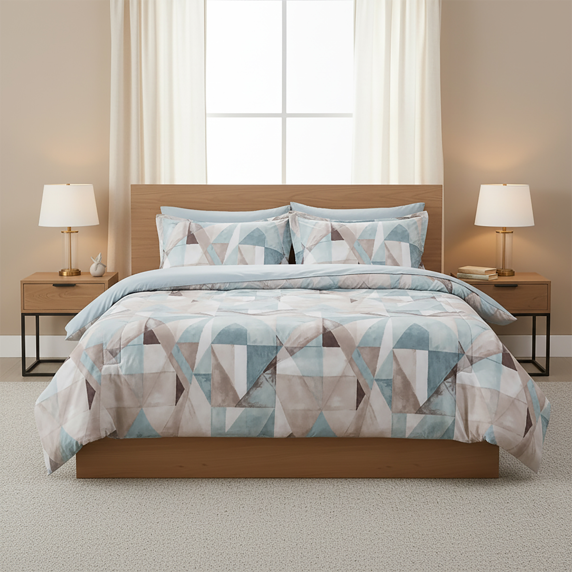 الطقم يتضمن 1 لحاف 250*260سم ، 2 وسائد 50*75سم ، 2 وسادة مزخرفة 50*75سم، 1 شرشف سرير مطاط 200*200سم