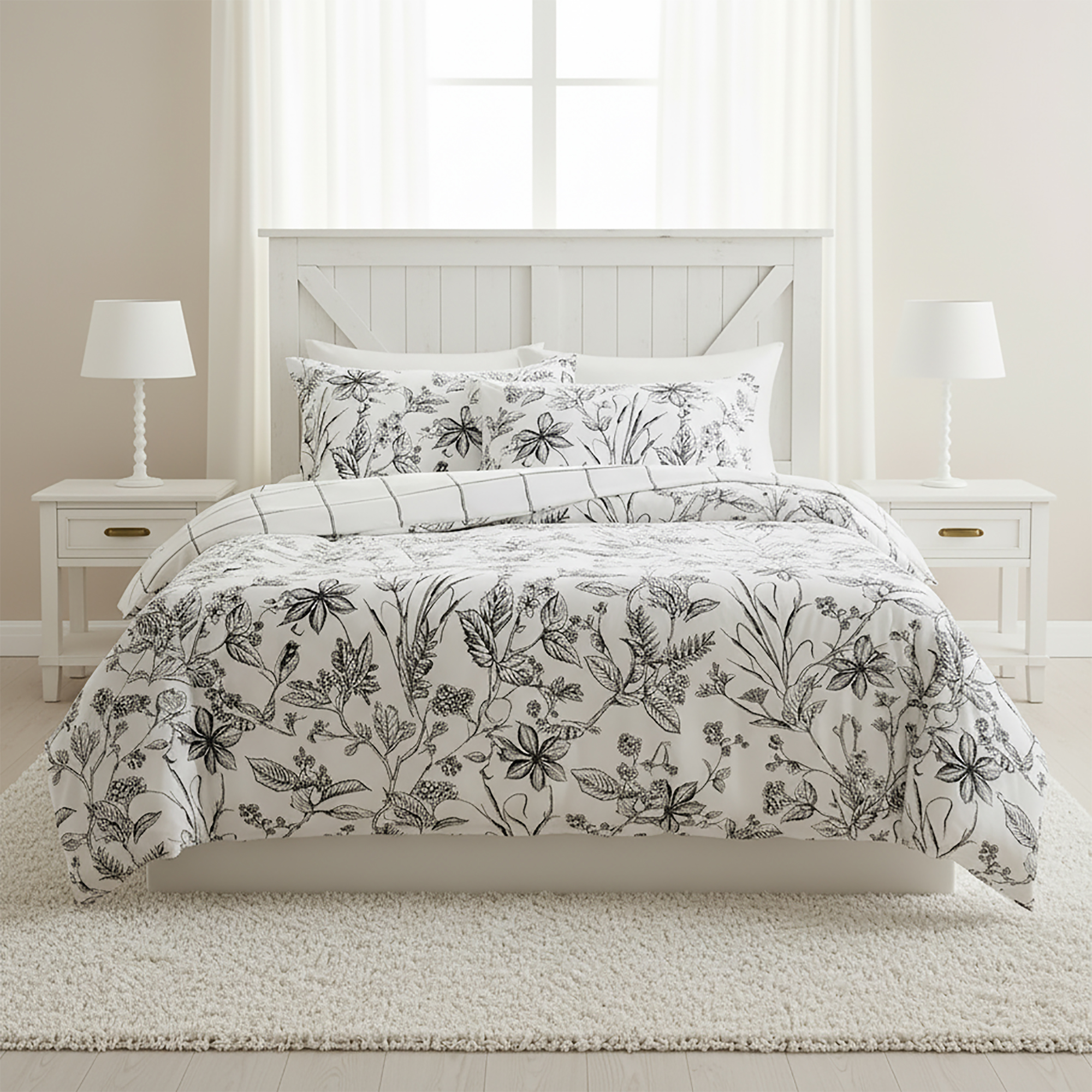 الطقم يتضمن 1 لحاف 160*240سم، 2 وسائد سادة 50*75سم، 2 وسادة مزخرفة 50*75سم، 1 شرشف سرير مطاط 120*200سم