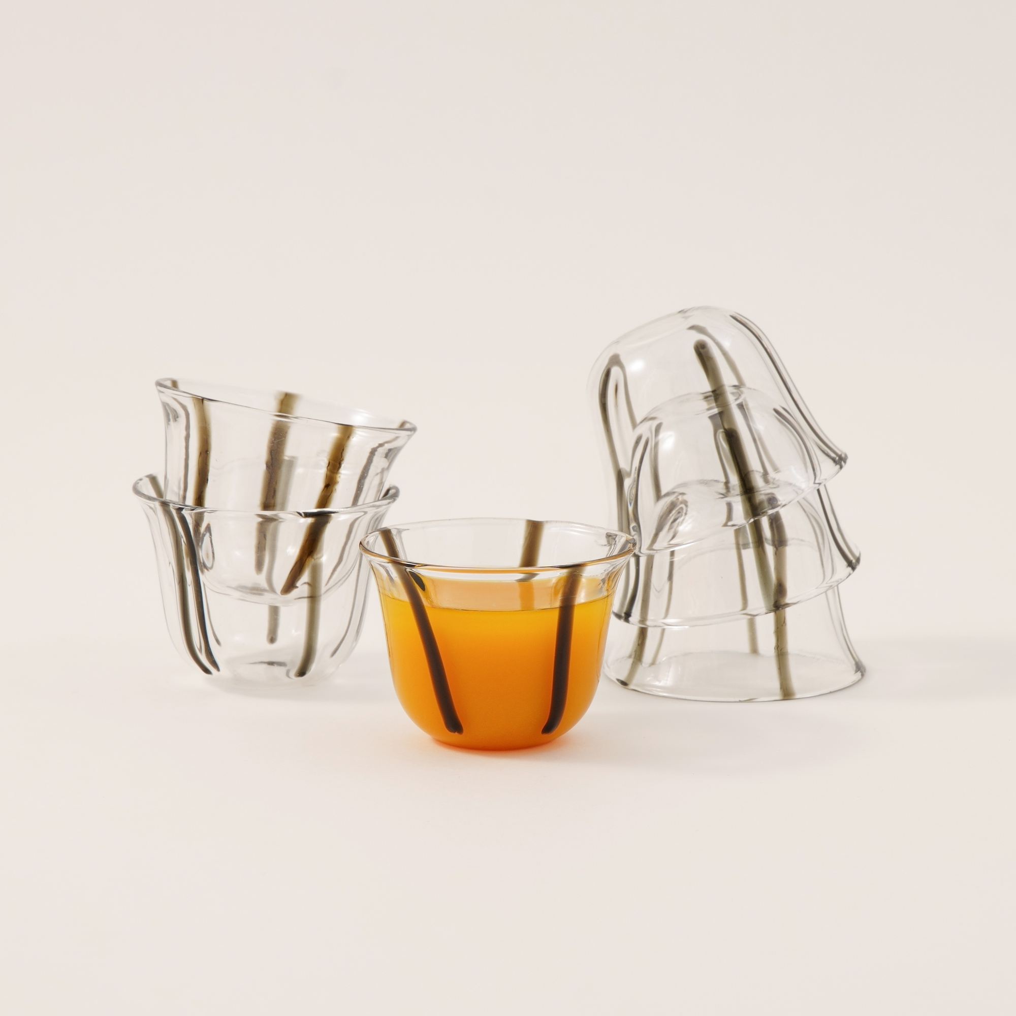 طقم دلتي المكون من 6 فناجين قهوة زجاجية مزينة بخطوط سوداء أنيقة يجمع بين الحداثة والأصالة.