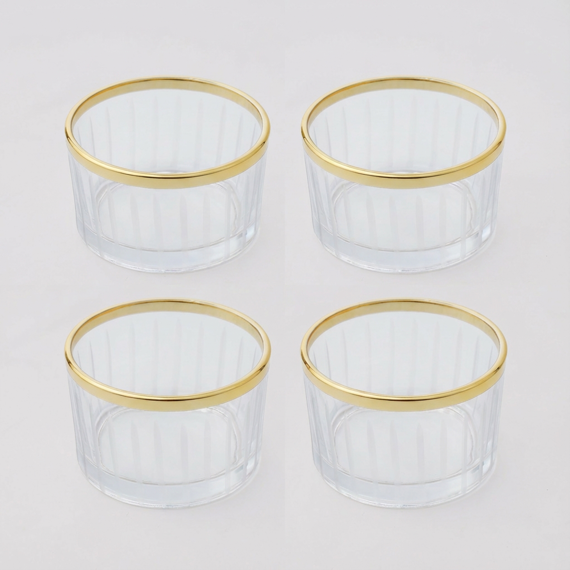 أضيفي لمسة فاخرة إلى سفرة رمضان مع طقم الأوعية الزجاجية بحافة ذهبية من دلتي، عدد 4 قطع. يبرز التمر والحلويات بلمسة أنيقة ويكمل ديكور السفرة في استضافة الضيوف.