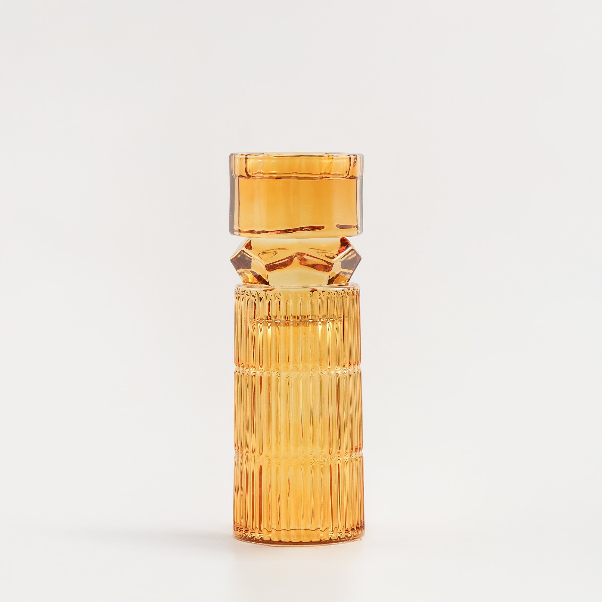 حامل شموع مضلع من هومز مصنوع من الزجاج عالي الجودة باللون برتقالي يضيف لمسة ديكور أنيقة ودافئة لأي مساحة، مناسب للشموع الطويلة ويكمل تنسيق الطاولة أو الأرفف بشكل راقٍ، الأبعاد 8.9*8.9*27.4 سم، الخامة زجاج.