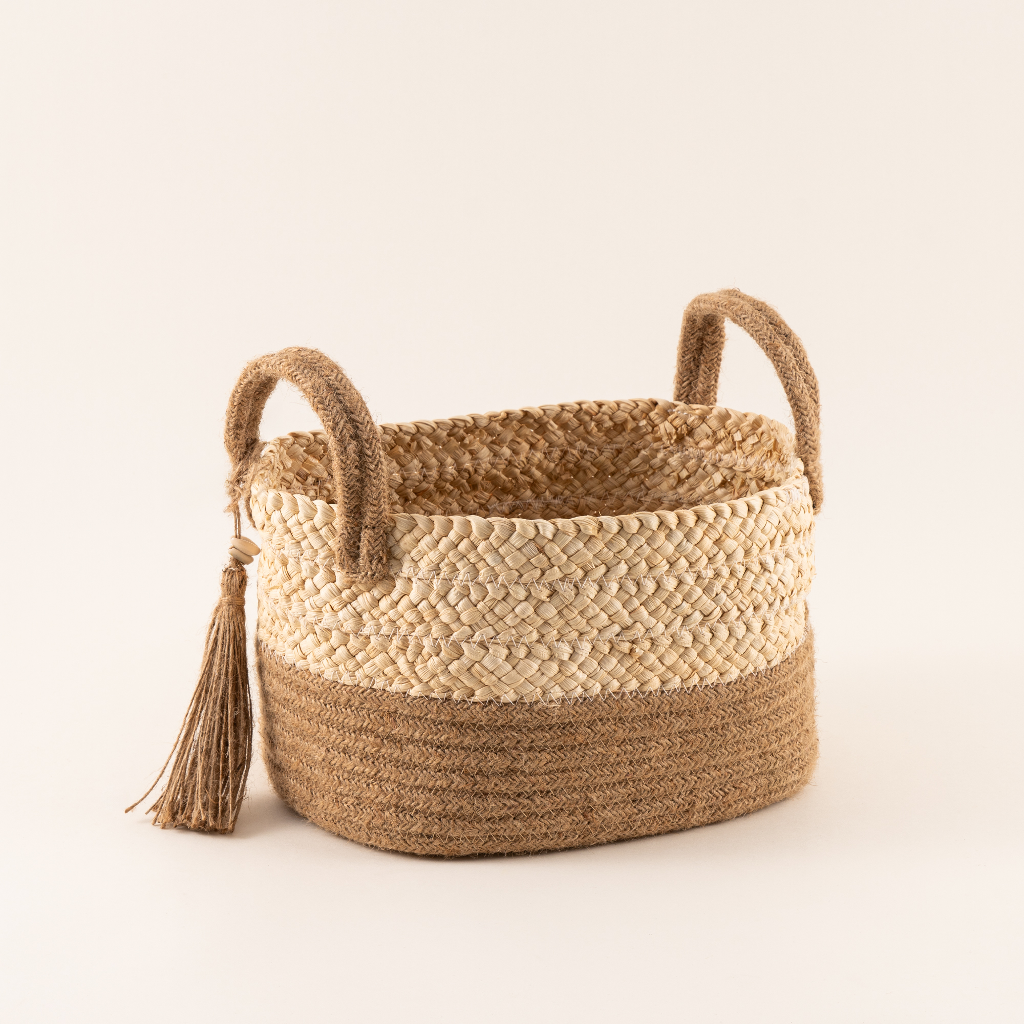 "هومز سلة تخزين مصنوعة من الذرة وحبال الجوت بتصميم يشبه الراتان ولون بيج، مناسبة للتخزين العملي مع لمسة ديكور هادئة وأنيقة. المقاس: 28*22*20 سم.