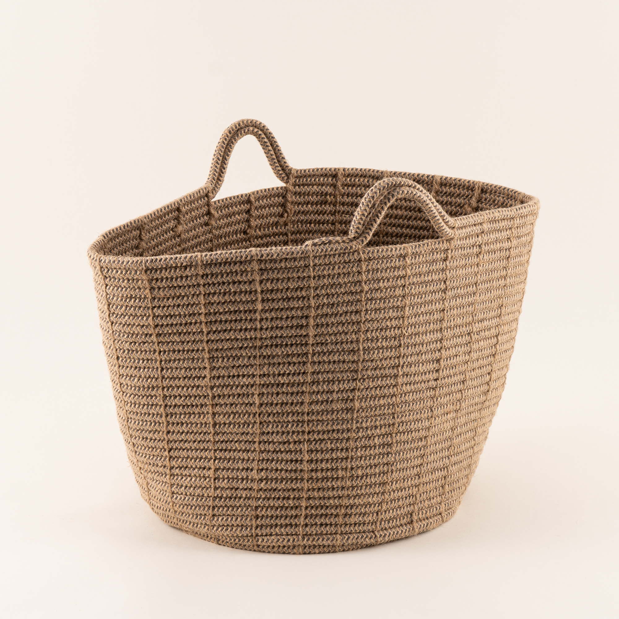 "هومز سلة تخزين مصنوعة من جوت طبيعي ممزوج ببولي قطن بتصميم مجدول يشبه الراتان ولون بني، مناسبة للتخزين العملي الواسع مع لمسة ديكور دافئة وأنيقة. المقاس: 39*39*34 سم.
