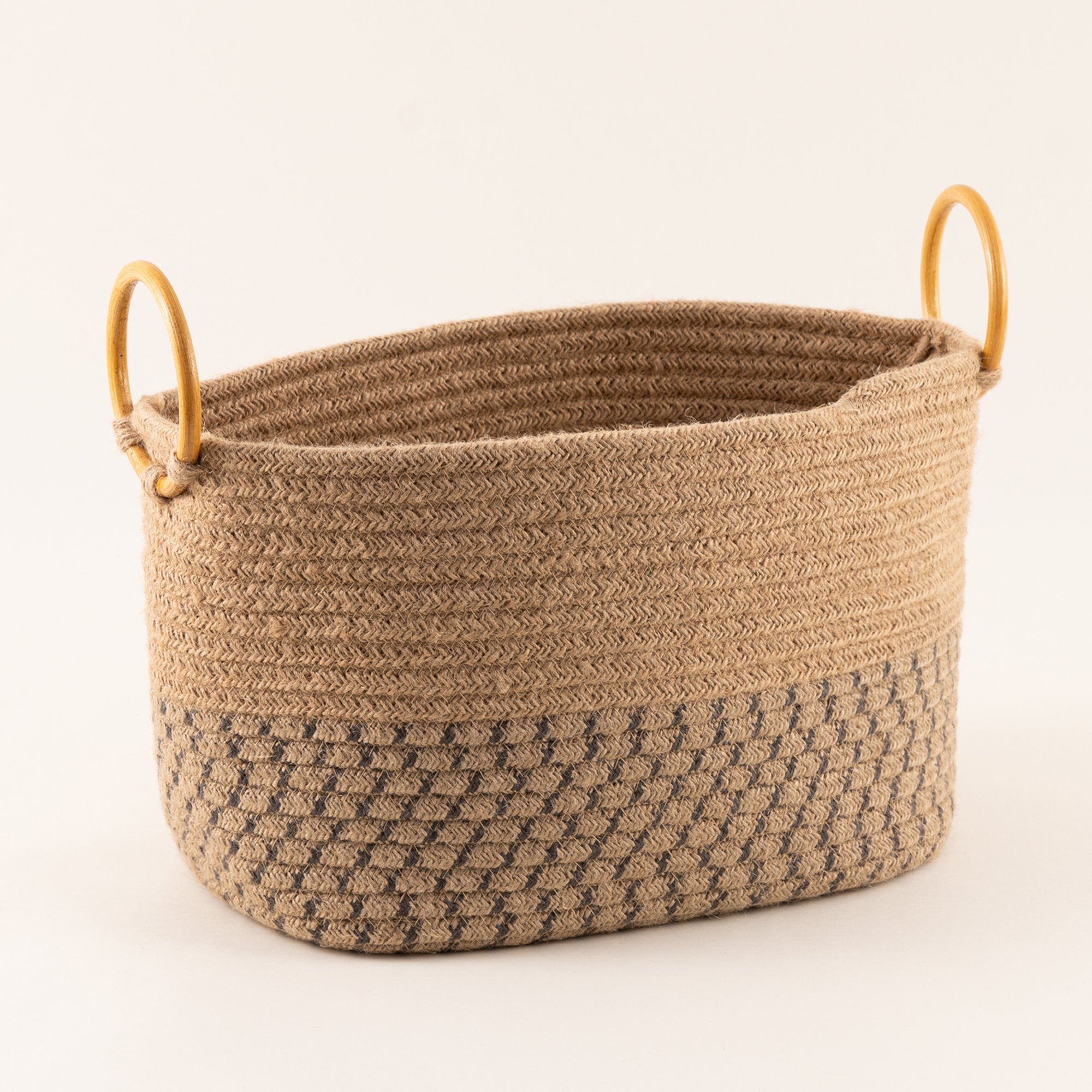 "هومز سلة تخزين مصنوعة من حبال الجوت ممزوجة ببولي قطن، بتصميم يشبه الراتان ولون بيج، مناسبة للتخزين العملي مع لمسة ديكور دافئة وأنيقة. المقاس: 40*30*30 سم.