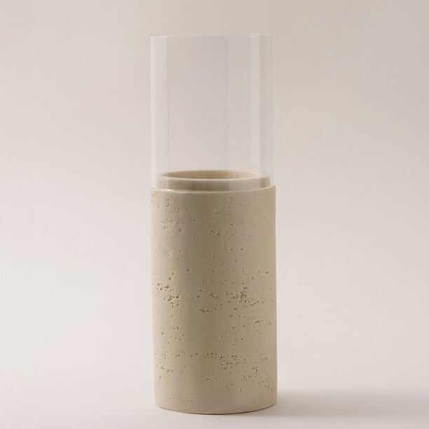 مستوحى من خامات الترافرتين الغنية، يضفي حامل الشموع هذا لمسة من الأناقة. يكمل الزجاج الشفاف تدرجاته الطبيعية ليعزز من جمال ديكورك. الأبعاد: 12.5*12.5*29سم.