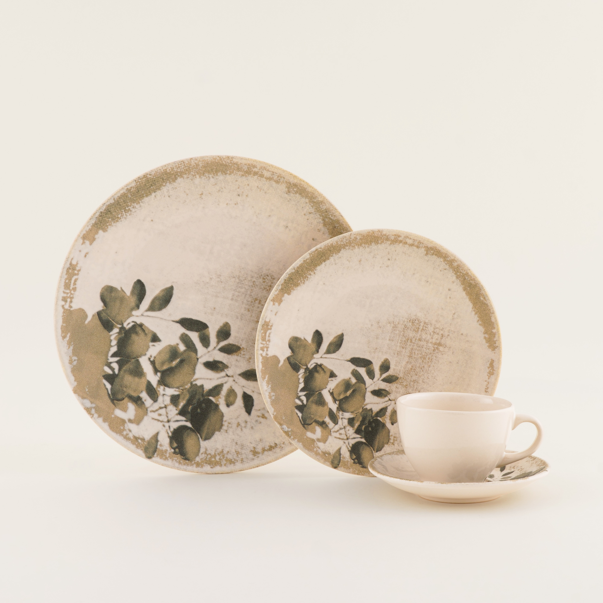 الطقم يتضمن 4 أطباق عشاء 26 سم، 4 أطباق جانبية 20 سم، 4 صحون 14 سم، 4 فناجين 9سم