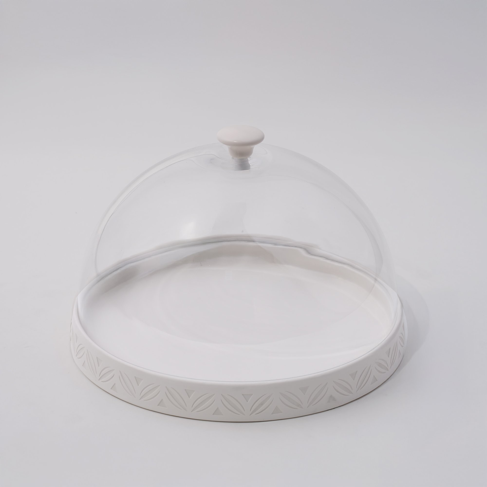 طبق تقديم أنيق بقاعدة مسطّحة من البورسلان وغطاء زجاجي شفاف مزوّد بمقبض علوي لسهولة الرفع. مصمّم لعرض وحماية الحلويات، الكيك، المعجنات أو التمر، مع الحفاظ على نضارتها وإبرازها بشكل واضح على السفرة.