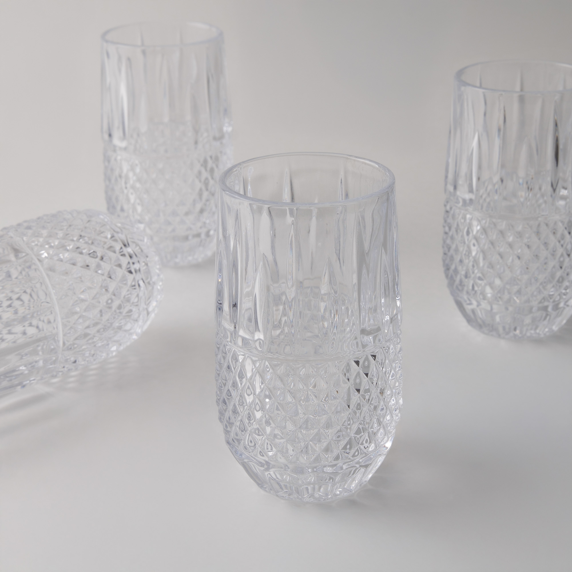 "لا ميسا طقم 4 كاسات عصير زجاج بتصميم أنيق ولمسة شفافة راقية. مصنوع من زجاج عالي الجودة بارتفاع 14 سم لكل كوب، مثالي لتقديم العصائر والمشروبات الباردة بأسلوب عصري وأنيق.