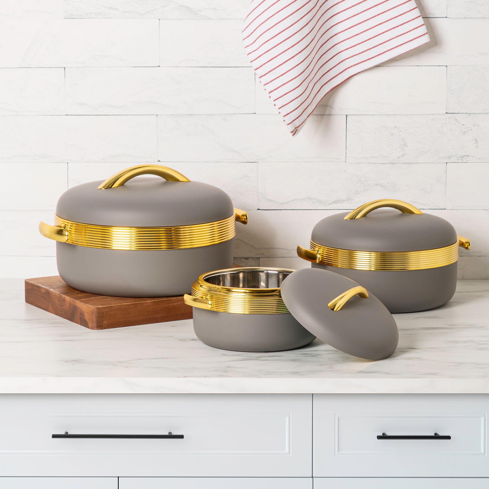 طقم بنتولا لتسخين الطعام من 3 قطع سعة 1.5 لتر + 2.0 لتر + 2.5 لتر خامة بلاستيك مع ستانلس ستيل يقدم حلاً عمليًا وأنيقًا للحفاظ على الطعام دافئًا وجاهزًا للتقديم. يتميز بجودة عالية وتصميم عصري يجمع بين الجمال والوظيفة. مثالي للوجبات العائلية، الحفلات، أو الضيافات، حيث يحافظ طقم بنتولا على درجة حرارة الطعام.