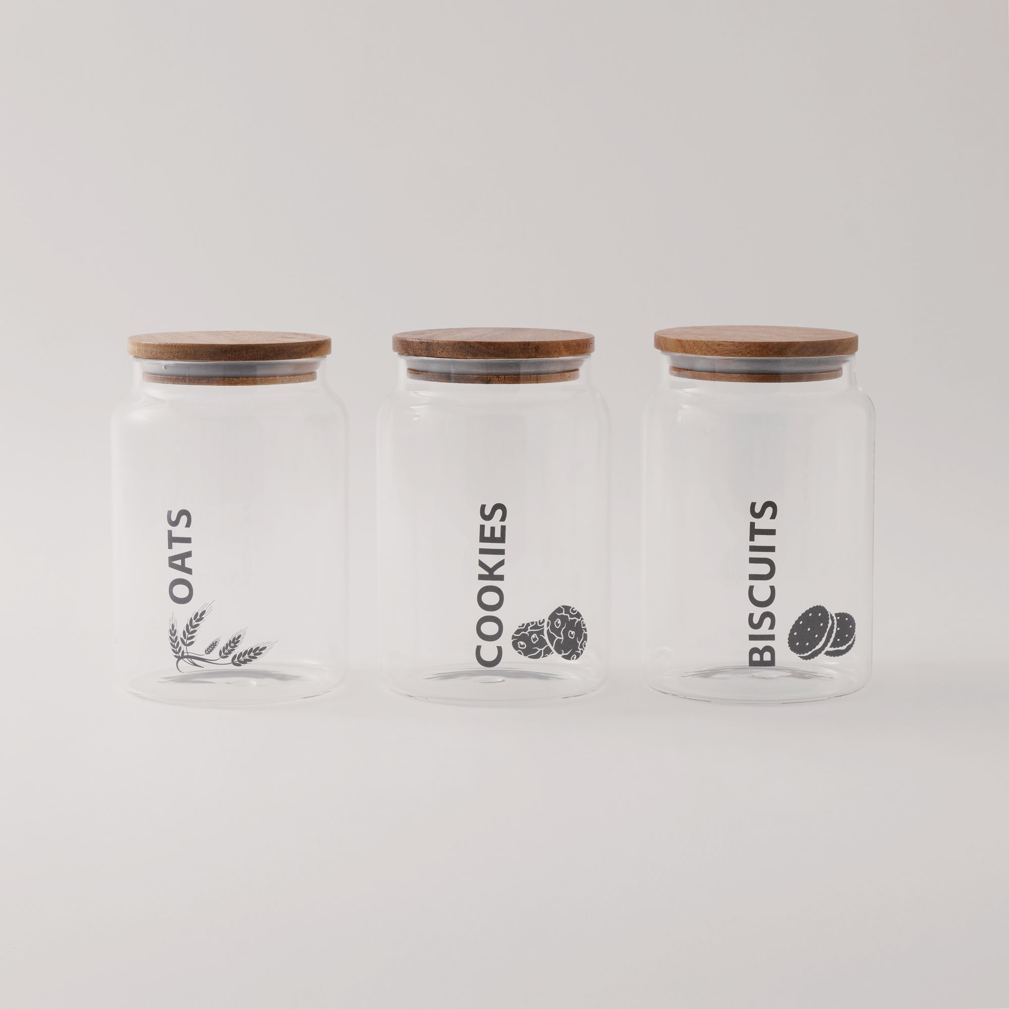 Set of three 1200ml glass jars with acacia wood lids. Suitable for storing coffee, sugar, or snacks. Airtight lids help maintain freshness and prevent moisture.