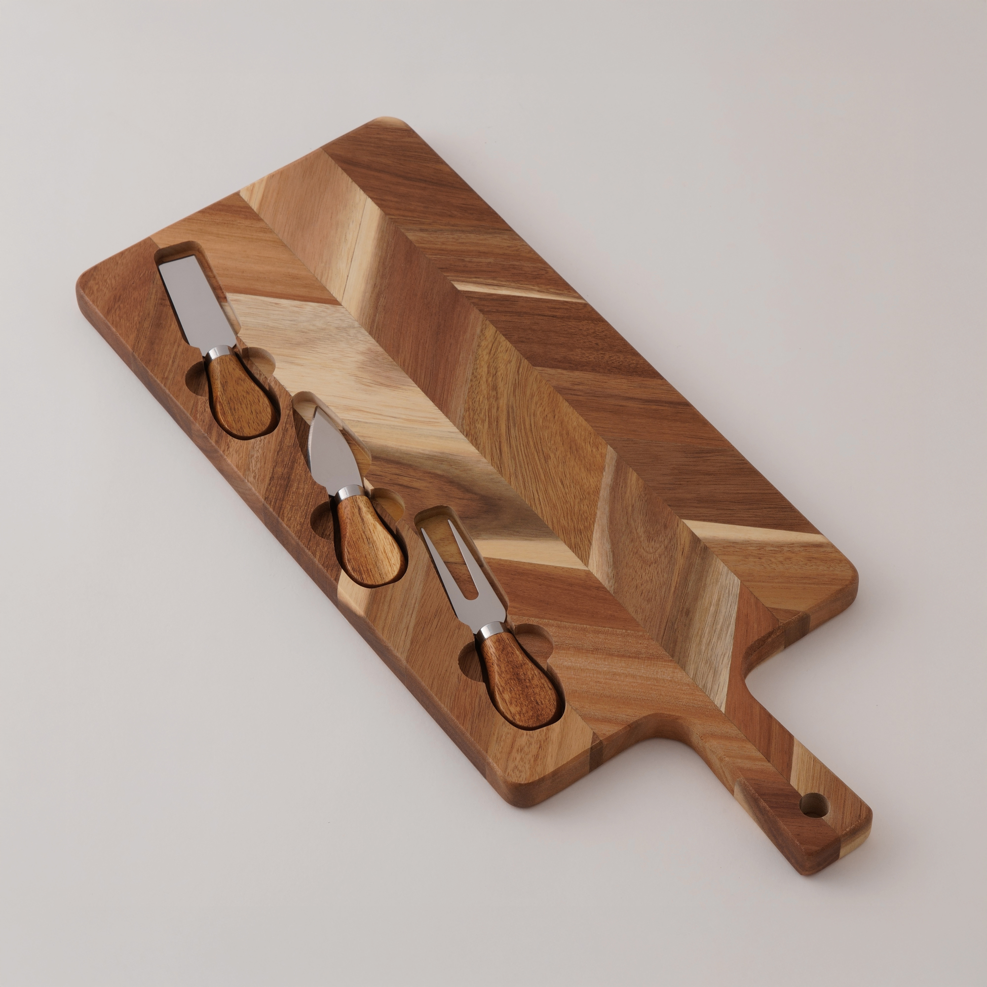 Alberto Offers A Cheese Board Made From Natural Acacia Wood, Measuring 48*20*2 Cm. It Comes With Three Cheese Knives Designed For Different Types Of Cheese. The Set Is Practical For Serving And Adds A Simple, Natural Touch To Your Table.