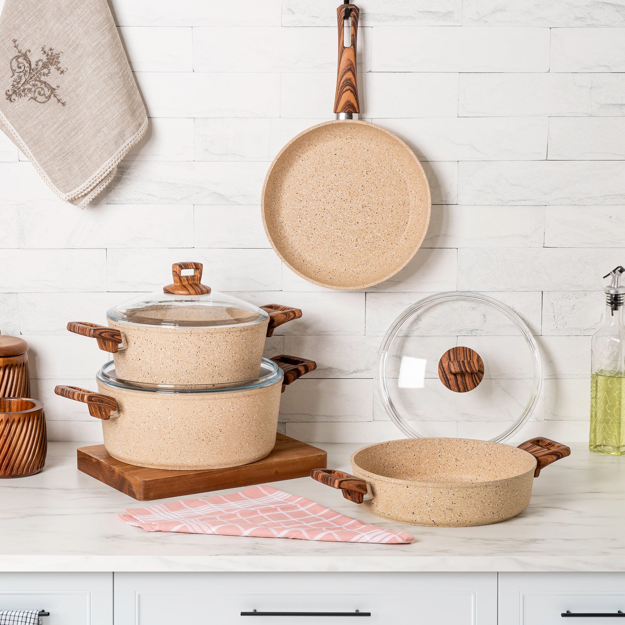 A 7 piece granite cookware set with non stick coating, suitable for everyday meal preparation. Includes versatile pot sizes and a frying pan to cover most cooking needs.