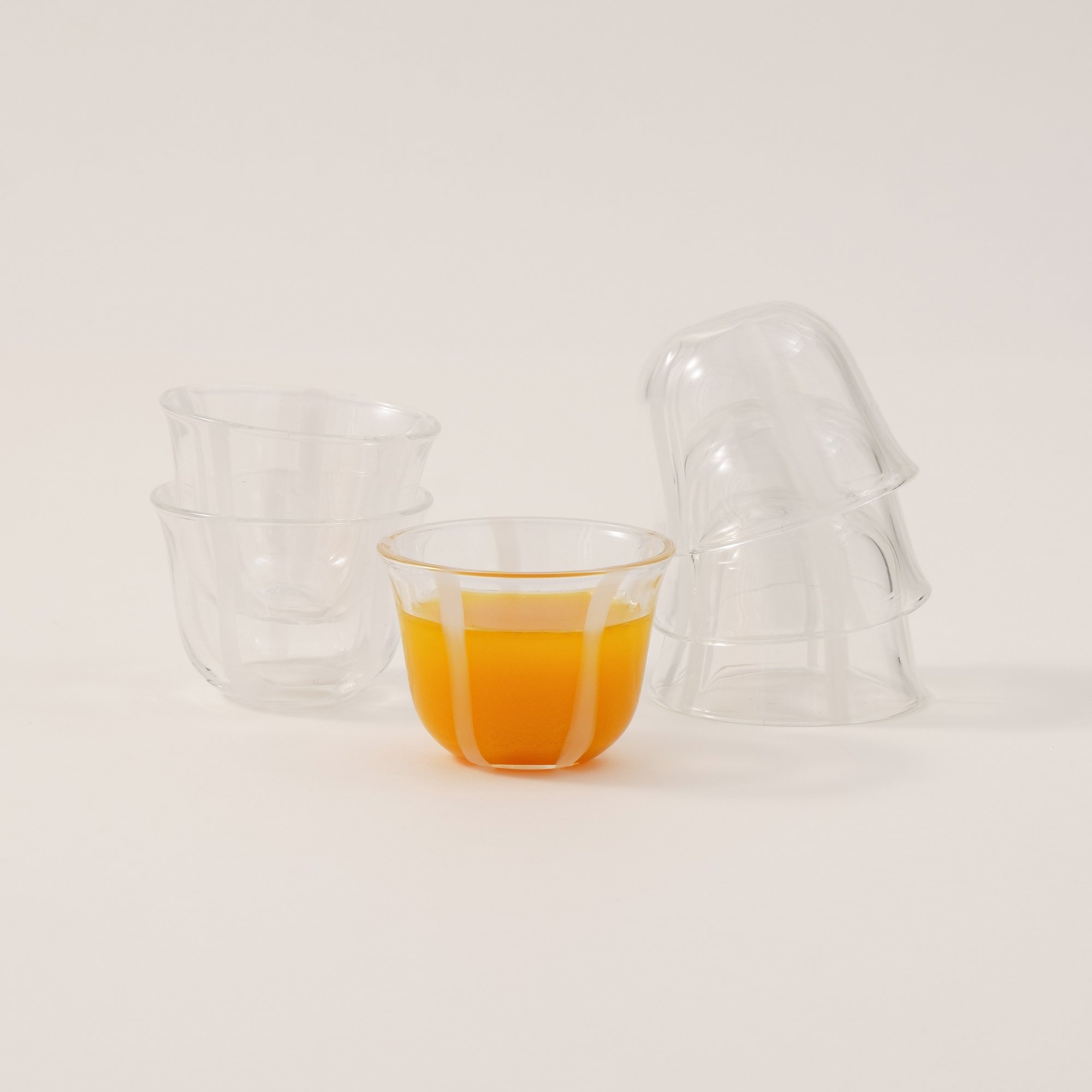 Glass coffee cup set designed for serving Arabic coffee. The set consists of 6 pieces made of clear glass with white line detailing. Designed for coffee serving within tea and coffee hospitality settings. Suitable for tabletop use and daily serving. The transparent glass structure highlights the beverage while maintaining a clean and consistent design.