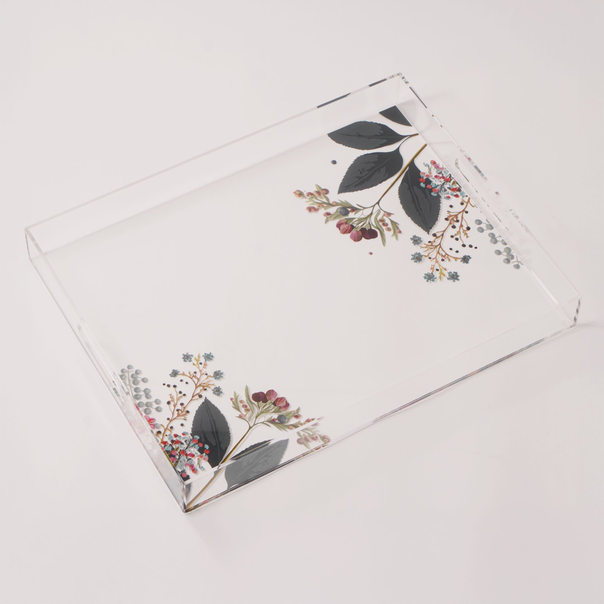 Delaty serving tray measuring 52*40*6 cm, featuring a sleek and functional design. Made from high quality clear acrylic with elegant floral prints in the corners, adding a refined artistic touch without obstructing visibility. Perfect for serving tea, coffee, juices, or desserts—ideal for both everyday use and special occasions.