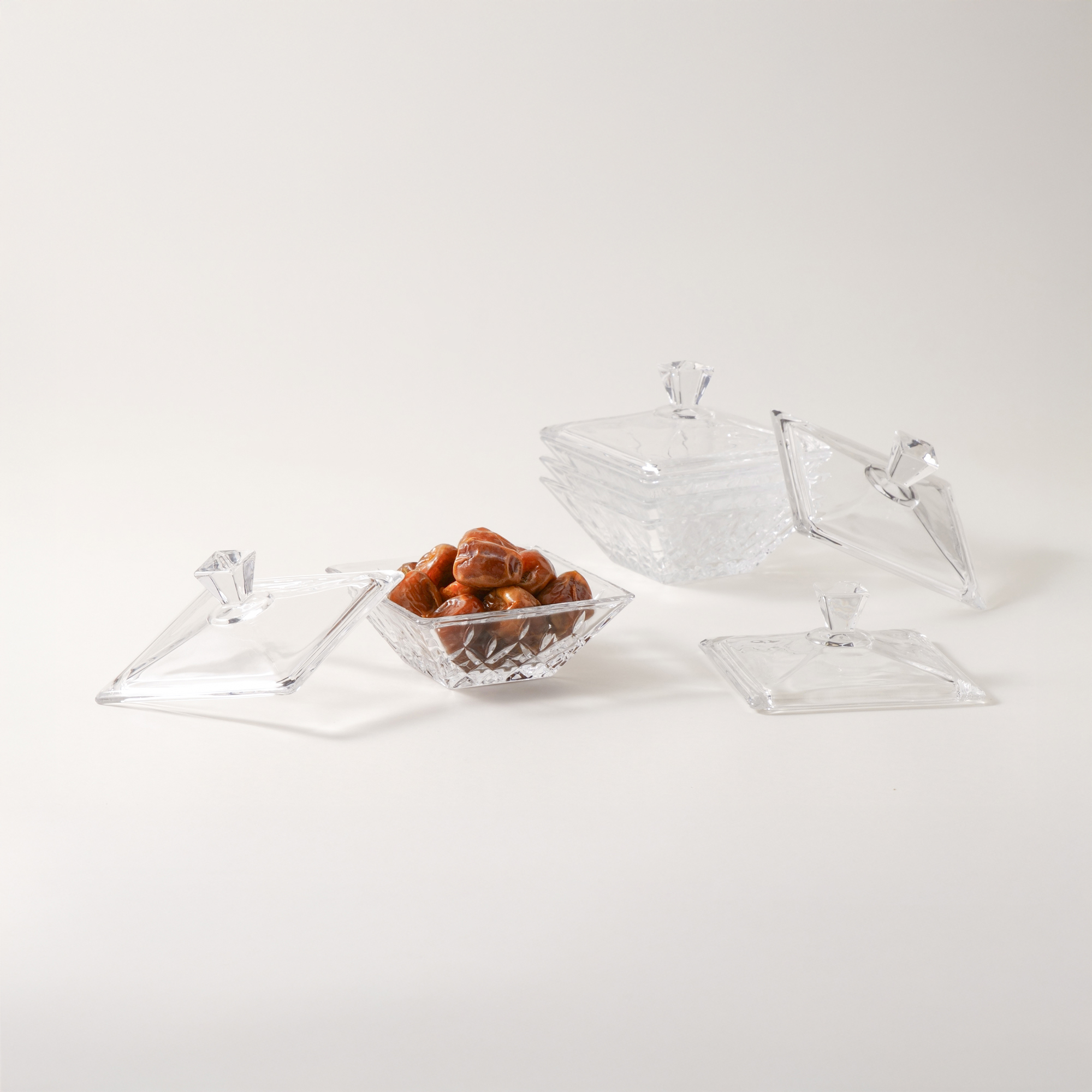 Clear glass date bowl designed for tea and coffee hospitality and tabletop serving. Made of glass with a transparent finish that allows full visibility of contents. Suitable for serving dates and dry snacks. Single piece design with lid.