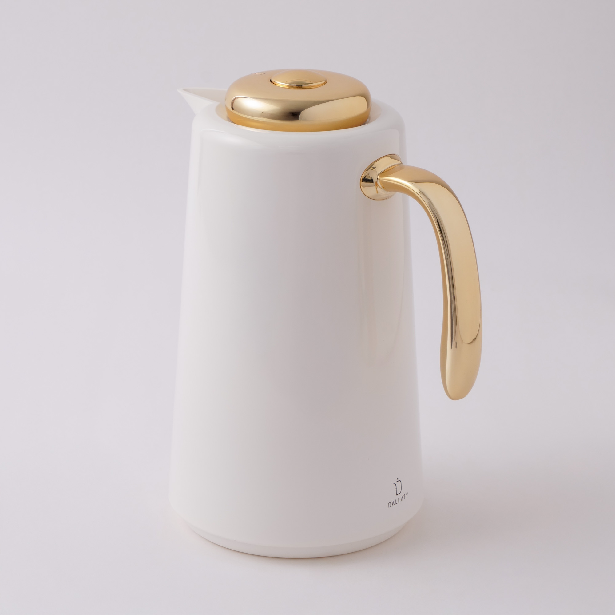Dallaty Plastic Vacuum Flask In White With Gold, 1 Liter Capacity. Made Of Durable Plastic With Handle For Comfortable Use. Suitable For Serving Coffee And Hot Drinks While Keeping Them Warm.