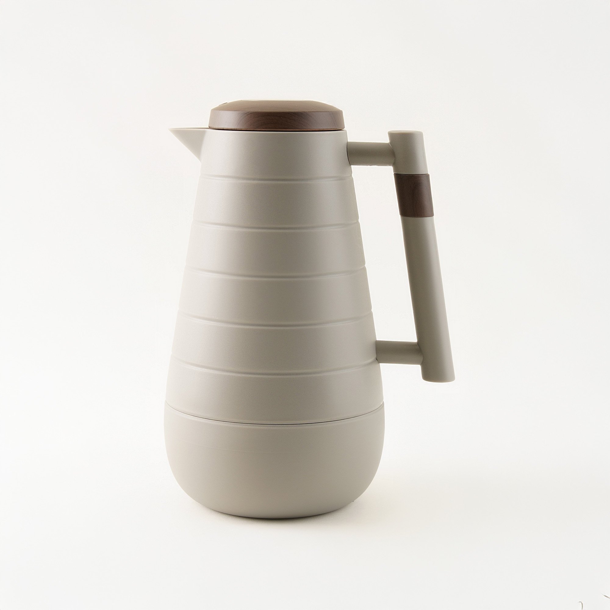 "Dallaty plastic vacuum flask beige with wood 1L is a practical and stylish coffee pot designed for everyday use. Made from durable plastic in an elegant beige color with wood look accents, it offers a lightweight yet attractive design. With a 1 liter capacity, it is ideal for serving Arabic coffee or tea while adding a modern touch to your table.