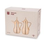 Keep your Arabic coffee hot with this unique white and golden color vacuum flask from Dallaty. It features an airtight lid with an elegant push button. The set consists of two vacuum flasks with different capacities 1 and 0.7 l.