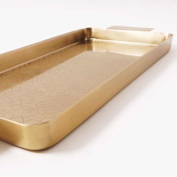 Dallaty steel serving tray in gold, size 57*25*3cm, a sturdy and practical rectangular tray, perfect for serving drinks, snacks, or desserts. The gold finish adds a warm and stylish touch to your table.
