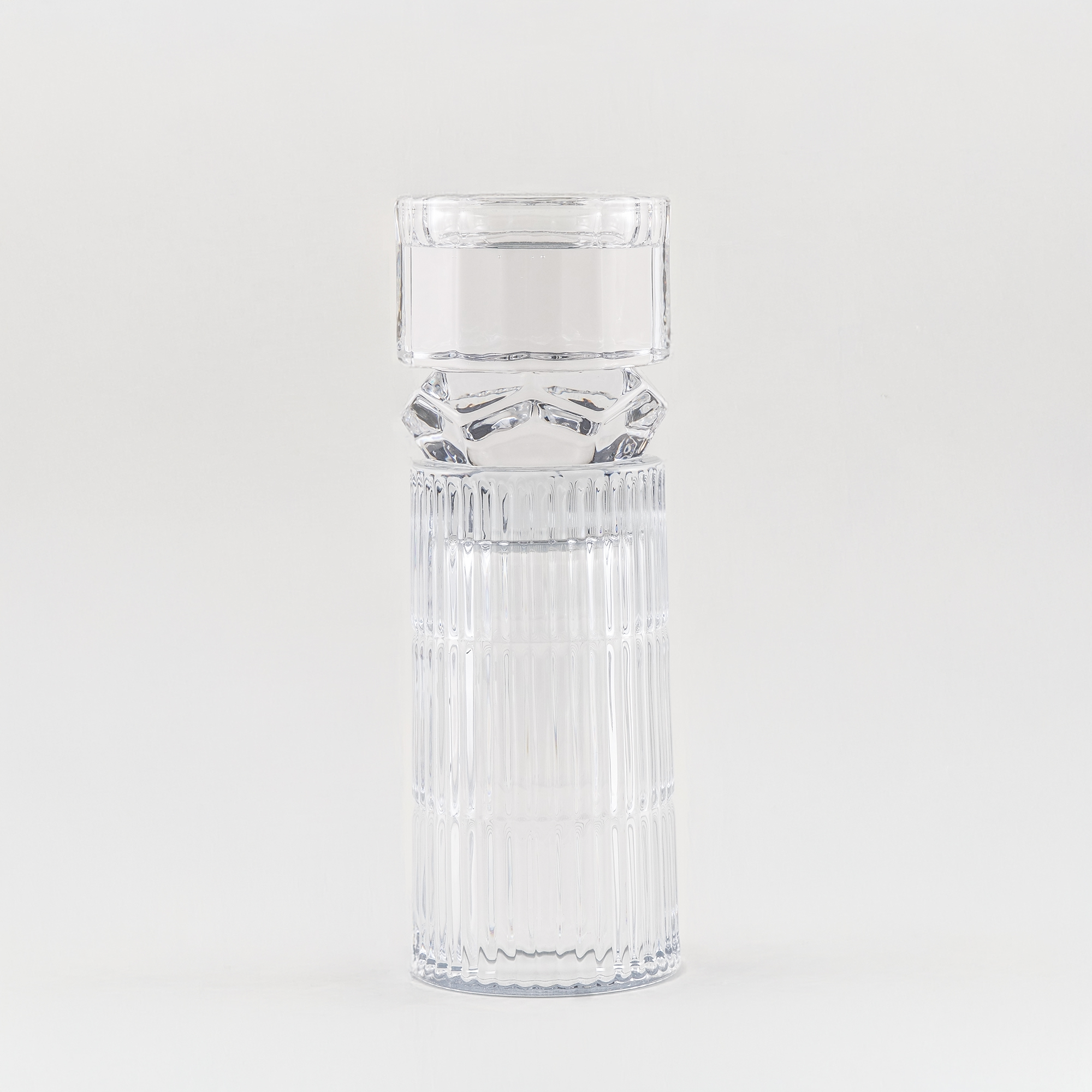 "This ribbed glass candle holder is suitable for taper candles and creates soft ambient lighting on dining tables or sideboards. The vertical shape adds a clean decorative accent, and the ribbed texture reflects candlelight warmly.