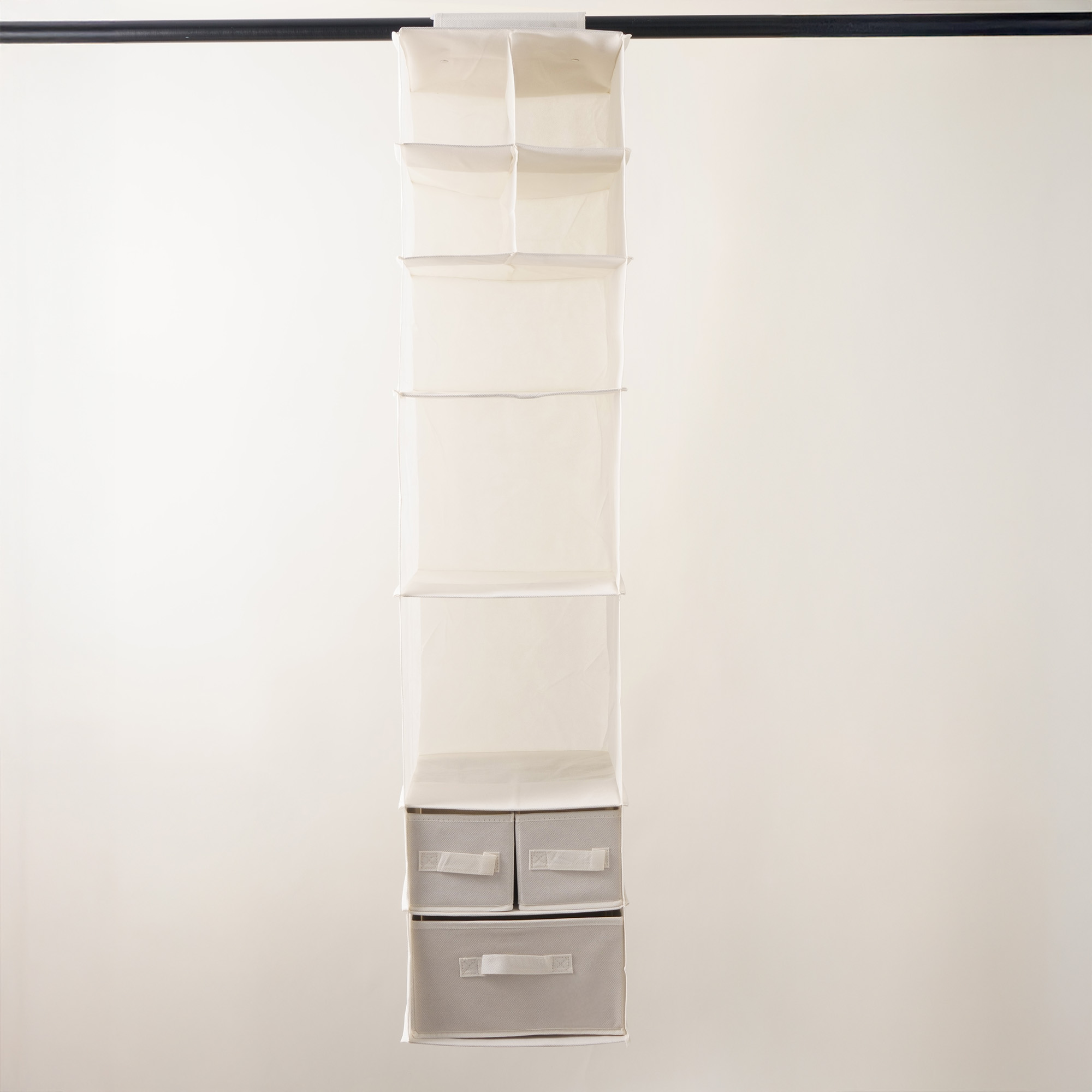 7 tier hanging closet organizer with 3 pull out drawers in beige polyester. Great for maximizing vertical closet space. Size: 32*62*32cm.