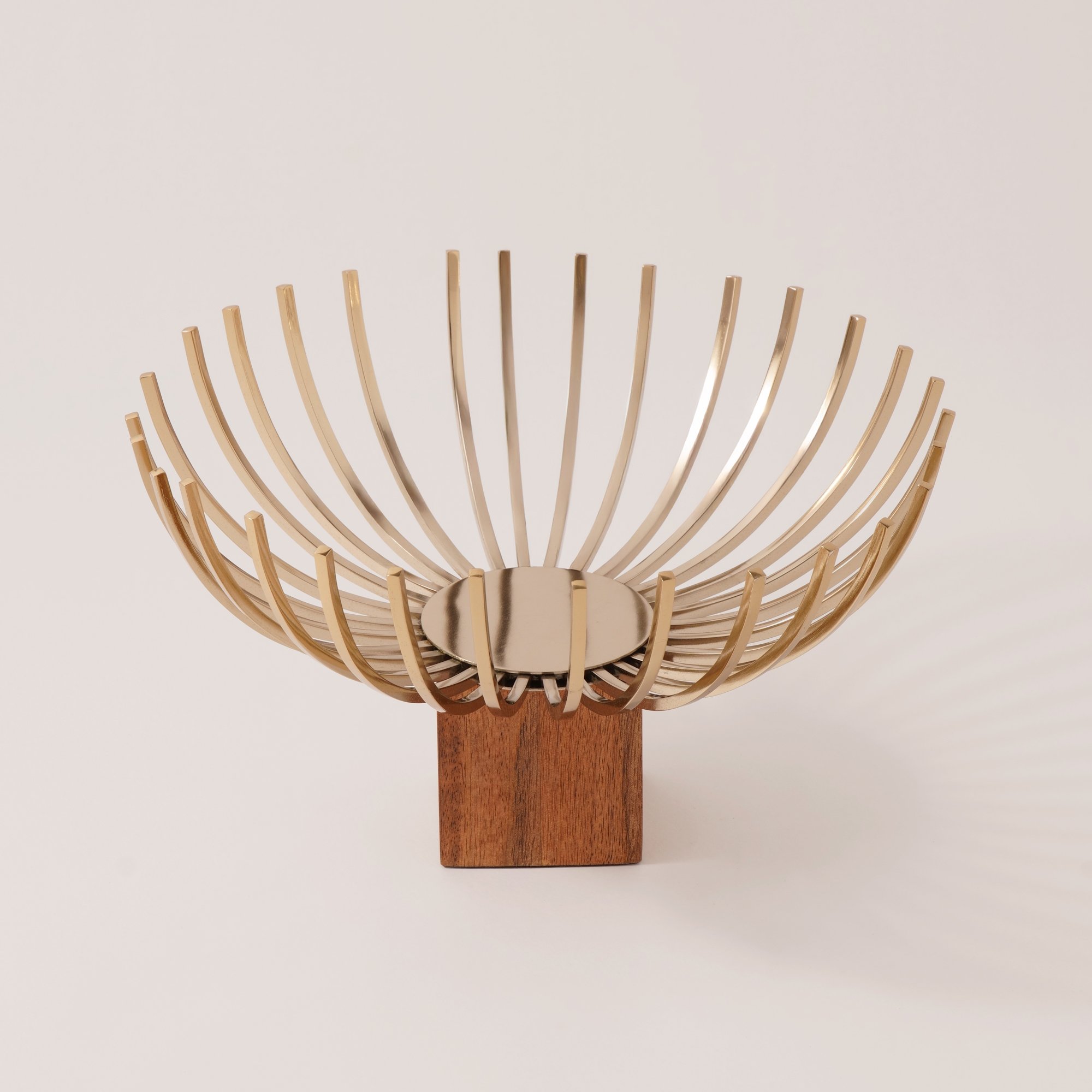 A modern fruit bowl designed with stainless steel rods and a wooden base that adds warmth and elegance. Its open structure helps keep fruits ventilated while serving as a decorative centerpiece for dining tables and kitchens.