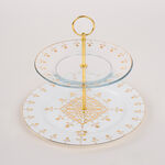 Introducing La Mesa gold porcelain and glass cake stand, a captivating addition to your dessert presentation. This elegant 2 tier serving stand is crafted from high quality porcelain and glass, showcasing a timeless gold hue is a must have. The cake stand comes in a generous size, which provides space for displaying cakes, pastries, cupcakes, and more.
