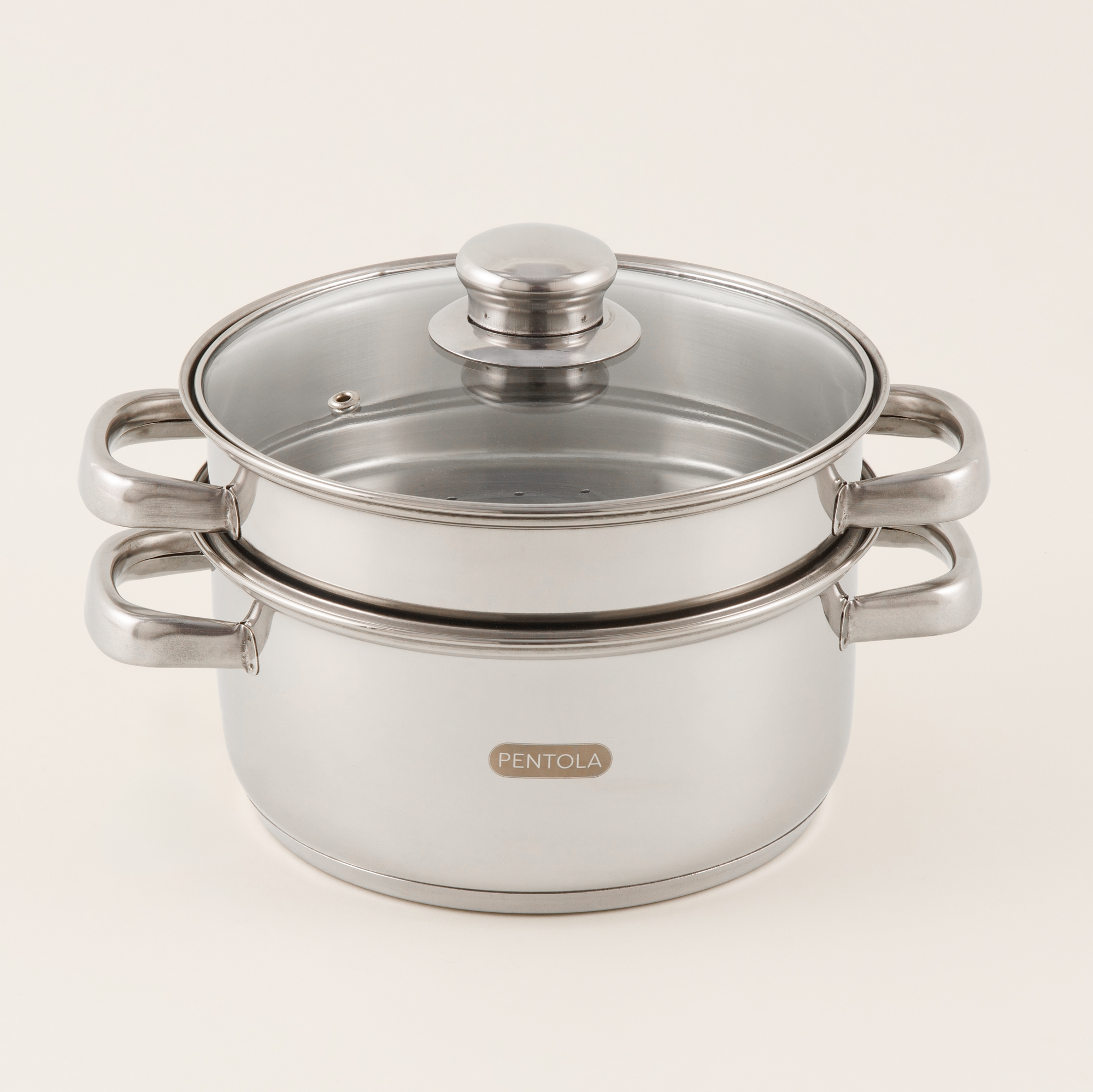 "Pentola presents a 20cm, 2 tier stainless steel steamer with glass lid, induction friendly and suitable for all stovetops. Made from elegant silver stainless steel, it allows healthy cooking of vegetables, meat, and fish with even heat distribution, easy cleaning, and long lasting durability.