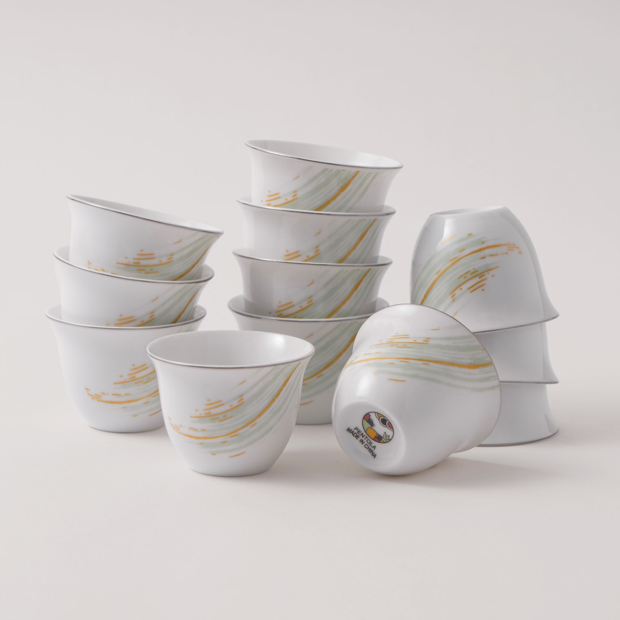 Pentola new bone 12 piece coffee cup set is designed for serving traditional arabic coffee in an elegant and authentic way. size 80cc. Each cup is crafted to reflect the cultural charm of Arabic hospitality, making it perfect for gatherings, special occasions, or daily use. A beautiful addition to your coffee serving collection.