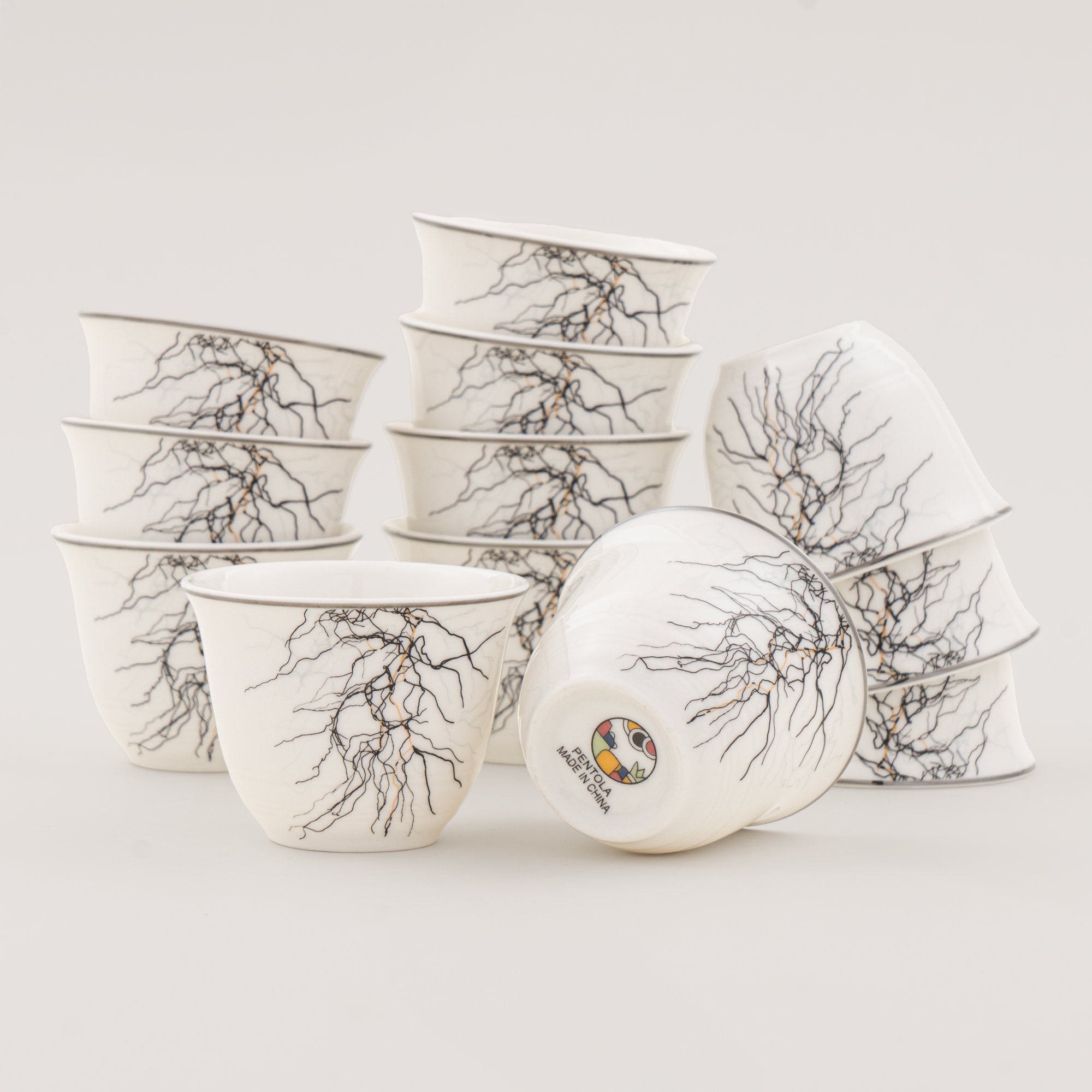 Pentola new bone 12 piece coffee cup set is designed for serving traditional arabic coffee in an elegant and authentic way. size 80cc. Each cup is crafted to reflect the cultural charm of Arabic hospitality, making it perfect for gatherings, special occasions, or daily use. A beautiful addition to your coffee serving collection.